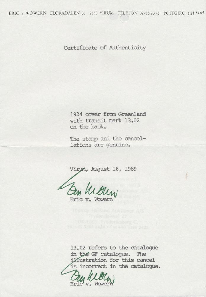 | Zusatzinformationen und Suchstichworte: | Auction Galleries Hamburg 26. Auktion 18. - 19. November 2022 Los 367 D Grönland 1924 Brief freigemacht 10 Öre Danmark ab "Egedesminde" (Nord Grönland) nach Kopenhagen und da gestempelt KJÖBENHAVN 14,5,24, auf der Rückseite schwarz krönte Zweizeiler STYRELSEN von KOLONIERNE GRÖNLAND. Selten commerceial Verwendung! Eric Wovern Fotoattesten Ausruf 240,00 EUR |