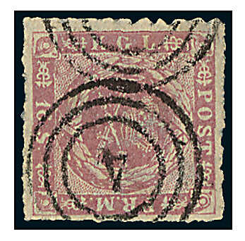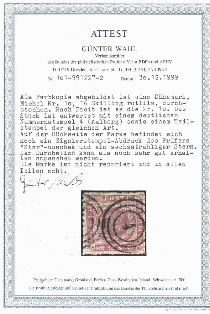 | Zusatzinformationen und Suchstichworte: | 113. Kirstein-Larisch Auktion 1. - 3. Dezember 2022 Los 1425 Dänemark 1863, 16 S. rotlila, sehr gut durchstochenes Kab.- Stück mit klarem 3-Ring- Nrn.- Stpl. "4" (Aalborg), gepr. Starauschek, Fotoattest Wahl Ausruf 70,00 EUR |