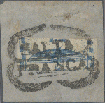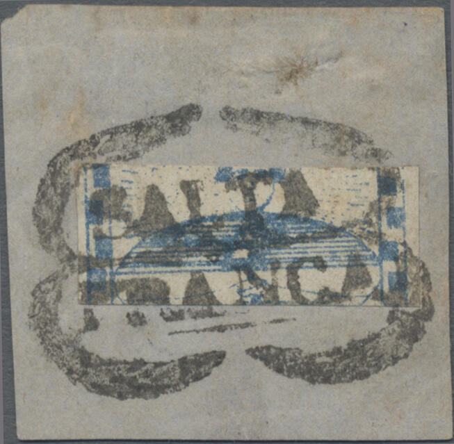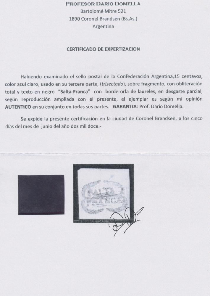 | Zusatzinformationen und Suchstichworte: | Christoph Gärtner 54. Auktion 18. - 19. Oktober 2022 Los 3214 D Argentinien 1858 Confederation issue 15c. blue, one THIRD, tied by fine strike of "SALTA/FRANCA" ornament h/s in black to small piece, fine and rare. Prof. Dario Domella certificate (2012). ÷ 1858 Confederación Argentina 15 C. azul claro, usado en su tercera parte (trisectado), sobre fragmento, con obliteración total y texto en negro "SALTA-FRANCA" con borde orla de laureles, autentico. Garantia Prof. Dario Domella (2012). (Ex W. Leupold collection) Zuschlag 540,00 EUR |