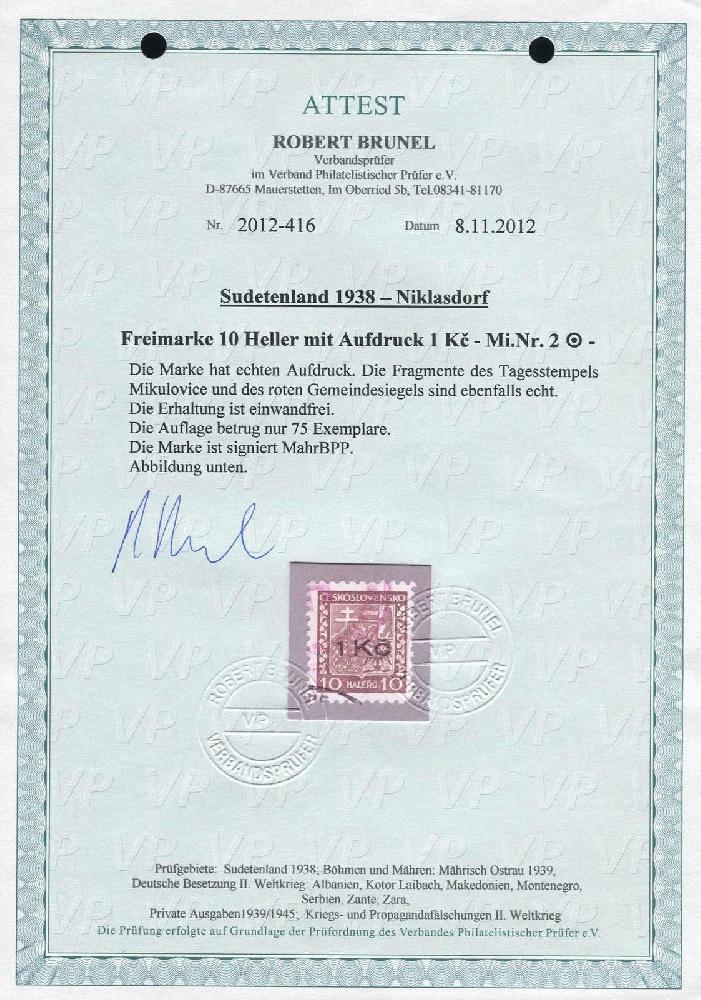 | Zusatzinformationen und Suchstichworte: | 31. Schlegel Auktionshaus Auktion 14. - 18. November 2022 Los 9276 Sudetenland Niklasdorf"1938, 10 H. Wappen braun, gestempelt, einwandfrei, Auflage nur 75 Exemplare, signiert Mahr BPP, Fotoattest Brunel (ME 2.000,-)" Ausruf 500,00 EUR |