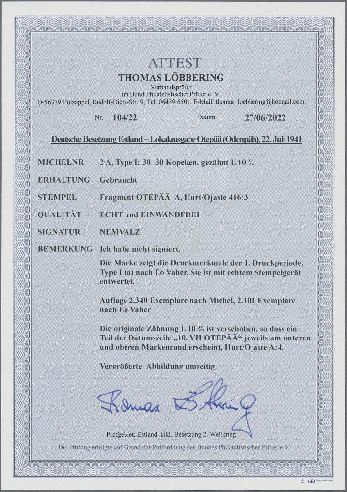 | Zusatzinformationen und Suchstichworte: | Christoph Gärtner 54. Auktion 18. - 19. Oktober 2022 Los 5667 D Deutsche Besetzung II. WK Estland Odenpaeh 1941, 30 + 30 K. schwarz/violettultramarin gezähnt, Type I, farbfrisches und gut gezähntes Exemplar sauber gestempelt "OTEPÄÄ A" (Hurt/Ojaste 416:3), Zähnung etwas dezentriert, so daß Datumszeile unten und oben, signiert Nemvalz sowie Fotoattest Löbbering BPP "einwandfrei". [Eho Vaher: 1.Druckperiode Type I (a), Auflage 2.101 Marken, bzw. 2.340 Stück nach Michel] Zuschlag 100,00 EUR |