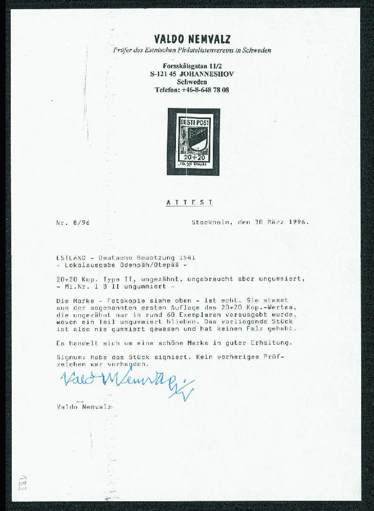 | Zusatzinformationen und Suchstichworte: | Gert Müller 116. Auktion 24. - 26. November 2022 Los 4254 Deutsche Besetzung II. WK Estland Odenpaeh 20 Kop. Wappenschild 1941, Type II, geschnitten, farbfrisch und tadellos, ohne Gummierung. Dieser Wert stammt aus der sogenannten 1. Auflage, die ungezähnt nur in etwa 60 Exemplaren verausgabt wurde, wovon ein Teil ungummiert blieb. Eine Rarität dieses Gebietes! Fotoattest "GUTE ERHALTUNG" Nemvalz. Ausruf 800,00 EUR |