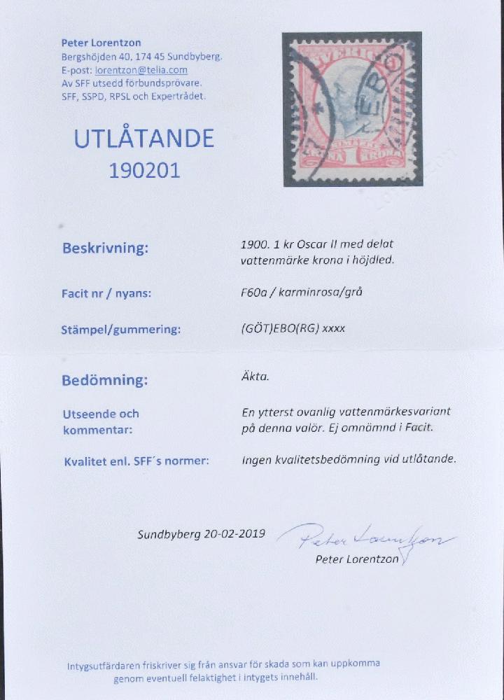 | Zusatzinformationen und Suchstichworte: | AB Philea 397. Auktion 24. November 2022 Los 2191 Schweden Sweden, Facit 60a vm2 used, 1900 Oscar II 1 Kr carmine/grey, parts of two wmk Crown vertically. Very scarce wm, according to Facit ONLY FOUR COPIES RECORDED. Opinion Lorentzon (2019) Ausruf 273,00 EUR |