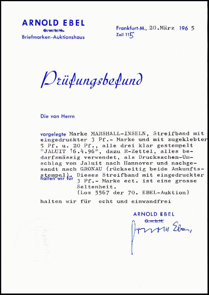 | Zusatzinformationen und Suchstichworte: | Württembergisches Auktionshaus 141. Versteigerung 10. Dezember 2022 Los 6800 + Deutsche Kolonien Marshall Inseln, Vorläufer 5 Pfg. mit 20 Pfg. ultramarin auf Ganzsachen-Streifband 3 Pfg. braun (leichte Faltspuren) als Einschreiben nach Hannover, drei klar aufges. Stempel JALUIT 16/4 96. Außergewöhnlich frisches und dekoratives Ganzstück, Attest Ebel Ausruf 1.000,00 EUR |