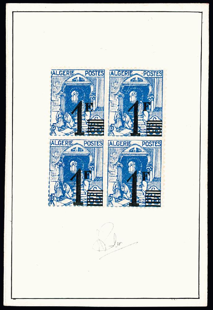| Zusatzinformationen und Suchstichworte: | Le Timbre Classique, Genf - 6. Auktion 26. Oktober 2022 Los 2312 Algerien 1F sur 65c bleu, projet de surcharge fait localement (la surcharge connue est 50c - n°166) en bloc de 4 monté sur un carton avec au dos mention "à mon avis le F est un peu petit", TTB, unique. Signé Calves Ausruf 2.800,00 EUR |