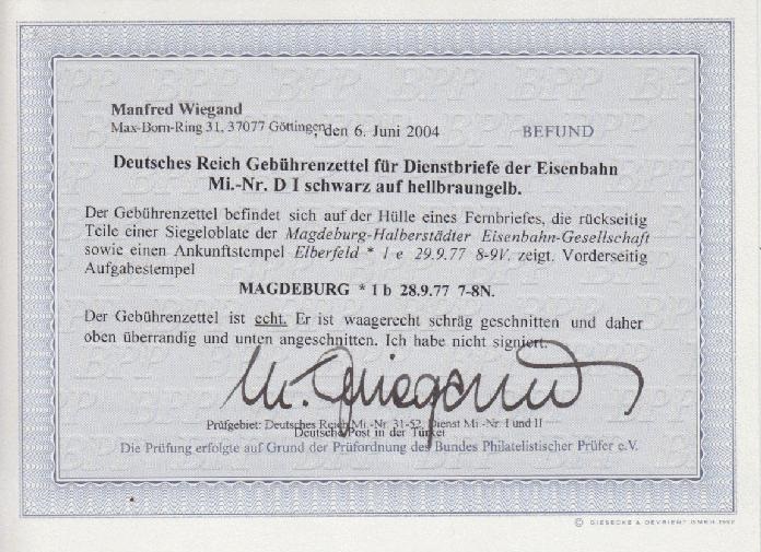 | Prüfgebiet: | Deutsches Reich Dienstmarken 1874 - 1945 |