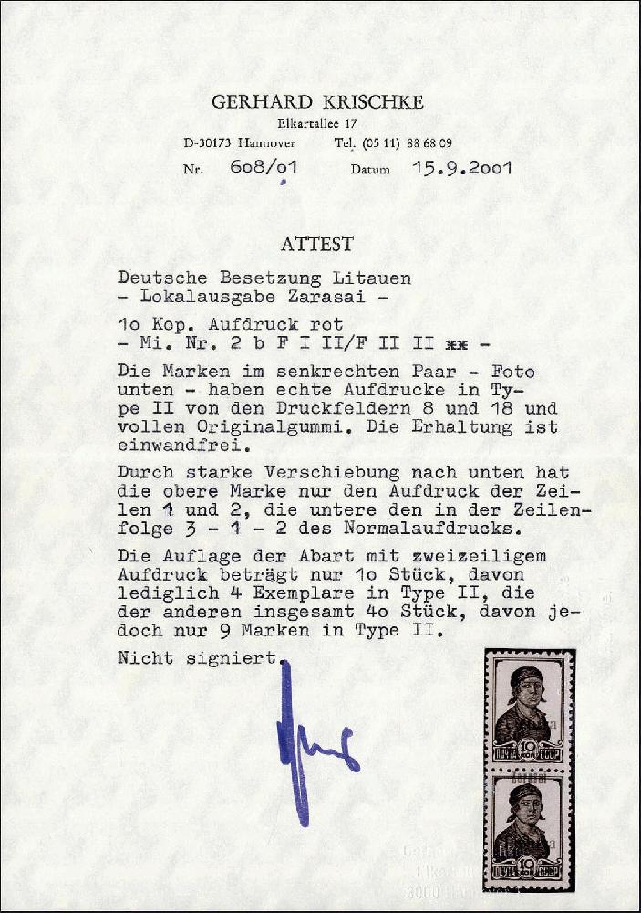 | Zusatzinformationen und Suchstichworte: | Götz 400. Auktion 11. - 15. November 2022 Los 3230 Deutsche Besetzung II. WK Litauen Zarasai10 Kop. preussischblau im senkrechten Paar mit rotem Überdruck in Type II vom Druckfeld 8 bzw. 18 mit stark verschobenem Aufdruck, dieser dadurch in Zeilenfolge 3 - 1 - 2, tadellos ** u. nur in wenigen Exemplaren bekannt geworden. Da die Auflage der Abart mit 2zeiligem Aufdruck nur 10 Exemplare, davon lediglich 4 Exemplare in Type II und die anderen insges. 40 Werte, davon jedoch nur 9 Marken in Type II, existent sind, so handelt es sich hierbei um ein seltenes Typenpaar, welches höchstens in einer Auflage von 4 Exemplaren existieren kann! Ausruf 600,00 EUR |