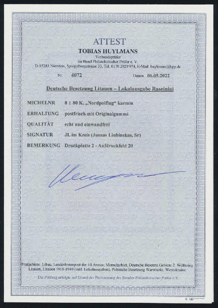| Zusatzinformationen und Suchstichworte: | 80. HBA Auktion 9. - 12. November 2022 Los 1666 (D) Deutsche Besetzung II. WK Litauen Raseiniai 1941, Sondermarke Nordpolflug mit Aufdruck in Type III, 80 K., dunkelbräunlichrot, tadellos postfrisches Kabinettstück, Altsign., Fotoattest Krischke und gepr. Huylmans mit neuem Fotoattest, Mi. 850,-- Zuschlag 300,00 EUR |