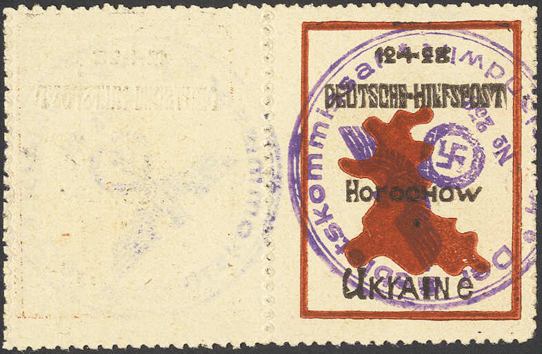 | Zusatzinformationen und Suchstichworte: | 71. Deider Auktion 24. November 2022 Los 196 Deutsche Besetzung II. WK Ukraine 1944, Gebietsausgabe Gorochow, 12+28 Pf. braunrot/schwarz, gezähnt 11 1/4, waagerechtes Kehrdruckpaar, wechselseitig auf Vorder- und Rückseite gedruckt mit violettem Dienststellenstempel (für die Entwertung nicht vorgesehen), Fotoatteste Pickenpack und Zirath BPP Ausruf 3.500,00 EUR |