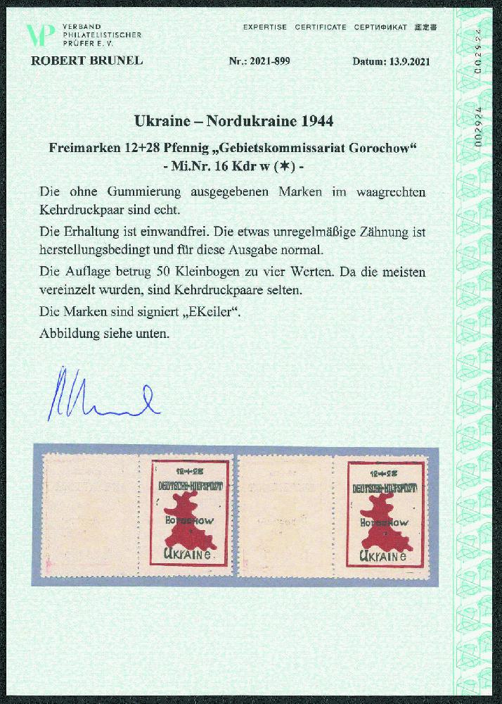 | Zusatzinformationen und Suchstichworte: | Gert Müller 116. Auktion 24. - 26. November 2022 Los 3658 Deutsche Besetzung II. WK Ukraine GOROCHOW-KEHRDRUCKPAAR: 12 Pfg. Hilfspost Gorochow 1944, das sehr seltene waagerechte Kehrdruckpaar, wundervoll farbfrisch, tadellos postfr., wie verausgabt auf ungummiertem Papier. Die Auflage belief sich auf lediglich 50 Kleinbogen (48 Stück gezähnt und 2 Stück ungezähnt), die nahezu alle in Einzelmarken zerteilt wurden. Kehrdruckpaare hiervon sind außerordentlich selten und nur noch in ganz wenigen Exemplaren erhalten geblieben. Ein Luxusstück dieser Besetzungs-Rarität für höchste Ansprüche! Fotoattest "DIE ERHALTUNG IST EINWANDFREI" Brunel. Ausruf 5.000,00 EUR |