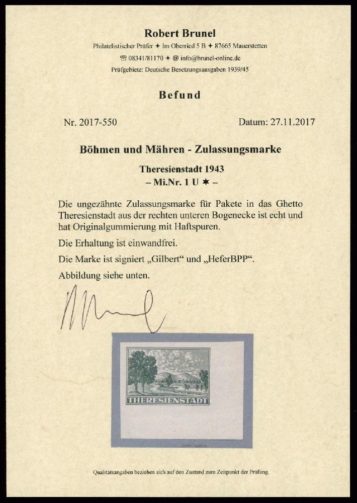 | Zusatzinformationen und Suchstichworte: | 80. HBA Auktion 9. - 12. November 2022 Los 1609 (D) Böhmen und Mähren 1943, Theresienstadt-Zulassungsmarke, schwärzlichgraugrün, breitrandig ungezähnt, sauber ungebrauchtes Kabinettstück aus der rechten, unteren Bogenecke, die Marke zeigt nur leichte Haftspuren, fast nur im rechten Rand, gepr. Gilbert und Hefer und gepr. Brunel mit Fotoattest, Mi. postfrisch 750,--, ungebraucht ca. 250,-- Zuschlag 140,00 EUR |