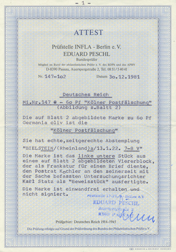 | Prüfer: | Peschl, Eduard (BPP (Bund Philatelistischer Prüfer)) |