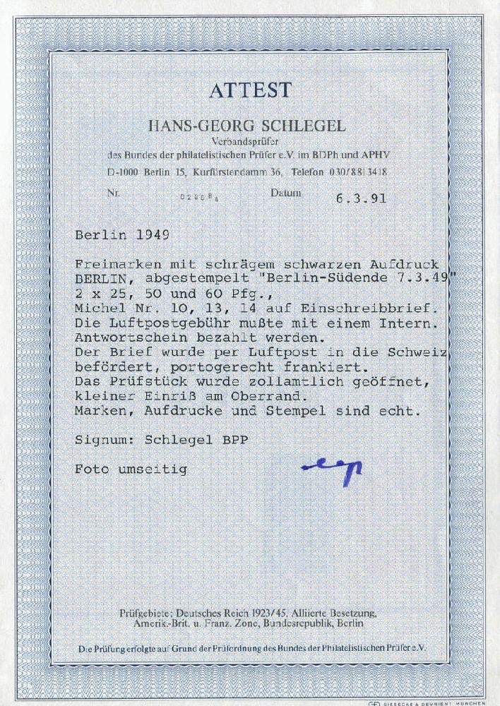 | Zusatzinformationen und Suchstichworte: | 31. Schlegel Auktionshaus Auktion 14. - 18. November 2022 Los 1073 Berlin 1949, IAS-LUFTPOSTBRIEF Europa mit Einschreiben ( 50 + 60 R, 50 LP ) mit 2 X 25, 50 und 60 Pfennig SA ab Berlin-Südende 7.3.49 nach Ascona in die Schweiz, Ankunft 10.III.49. Dazu Zollkontrolle beim Postamt SW 77. Signiert und 2 Atteste Schlegel BPP aus 1988 und 1991. Mit Einschreiben sehr seltene Version. Kleine Öffnungsbeanstandungen Ausruf 400,00 EUR |