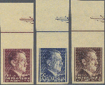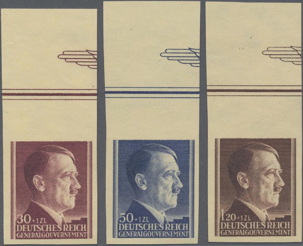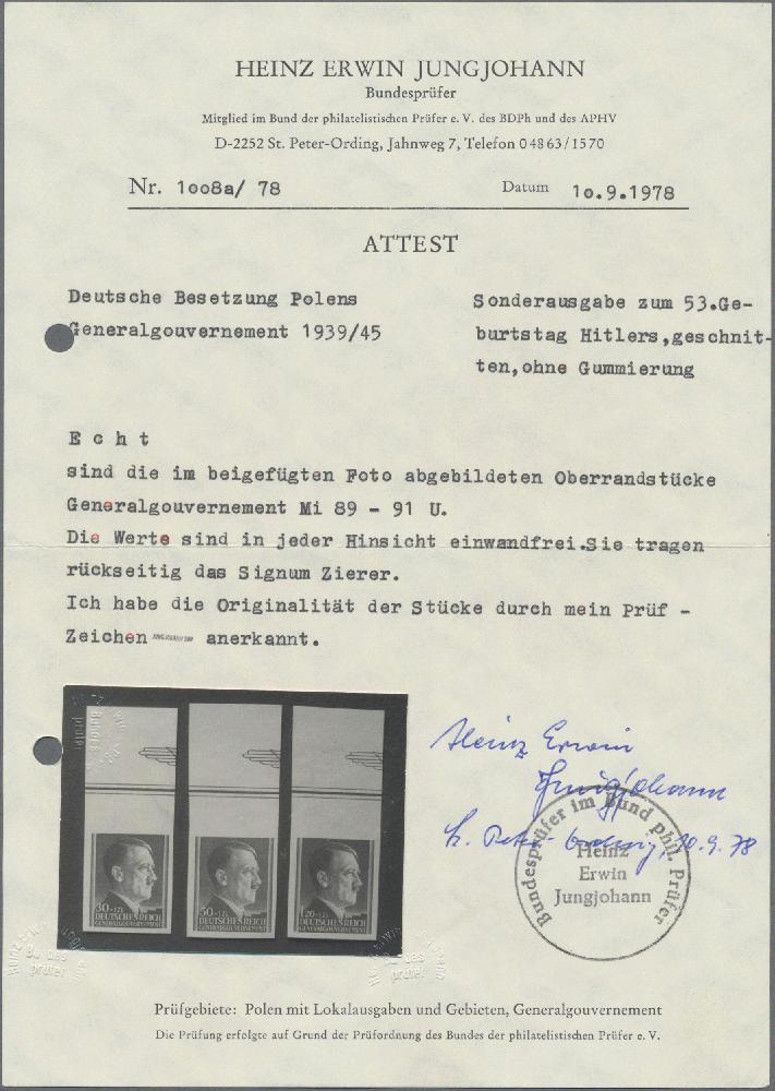 | Zusatzinformationen und Suchstichworte: | Christoph Gärtner 54. Auktion 18. - 19. Oktober 2022 Los 5684 D Generalgouvernement 1942, Hitler 53. Geburtstag, 30 Gr - 1 Zt auf Japanpapier, UNGEZÄHNT vom Oberrand, 3 Werte komplett sauber ungebrauchter Prachtsatz ohne Gummi, sign. Zierer und Jungjohann mit Fotoattest Zuschlag 950,00 EUR |