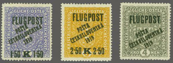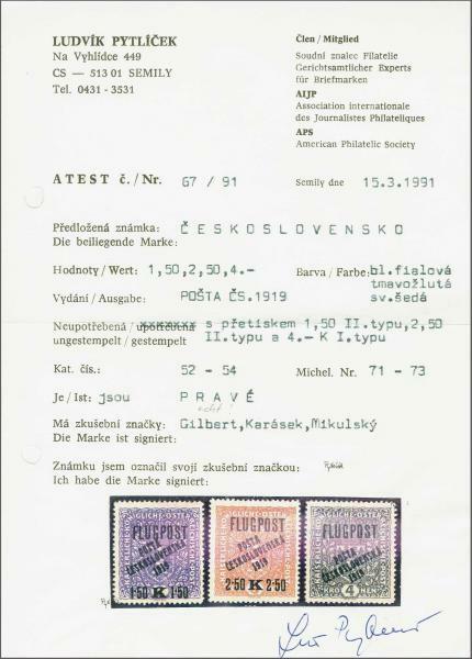 | Zusatzinformationen und Suchstichworte: | 291. - 297. Corinphila Auktion 28. November - 3. Dezember 2022 Los 278 Tschechoslowakei 1919: Airmail stamps 1k 50h violet, 2k 50h ochre and 4k grey all with additional three line overprint, three fresh copies with full og. bearing multiple signatures, including Gilbert, Karasek, Mikulski. The stamps come with a certificate Pytlicek (1991). A very rare and desirable set. Mi = €1'070. Ausruf 300,00 CHF |