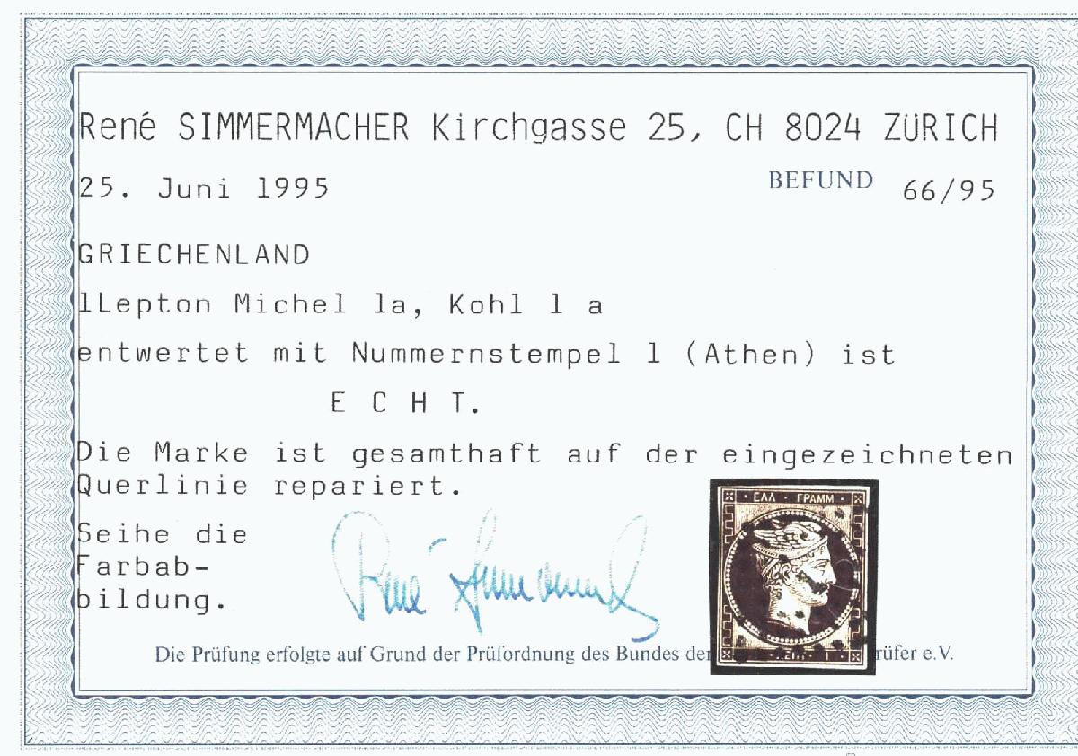| Zusatzinformationen und Suchstichworte: | 113. Kirstein-Larisch Auktion 1. - 3. Dezember 2022 Los 1543 Griechenland 1861, 1 L. dkl'braun auf bräunlich, rep., farbfrisches Exemplar mit fein zentr. Nrn.- Stpl. "1" (Athen) in schöner Optik, Fotobefund Simmermacher Ausruf 40,00 EUR |