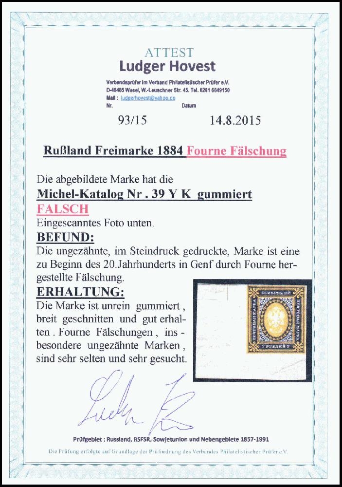 | Zusatzinformationen und Suchstichworte: | Württembergisches Auktionshaus 141. Versteigerung 09.-10. Dezember 2022 Los 1778 Russland 7 R., ungezähnte Fourné-Fälschung, tadellos postfrisch aus der li. unt. Bogenecke (dort Mgl.) mit unreiner Gummierung, Fotoattest Hovest. Ausruf 150,00 EUR |