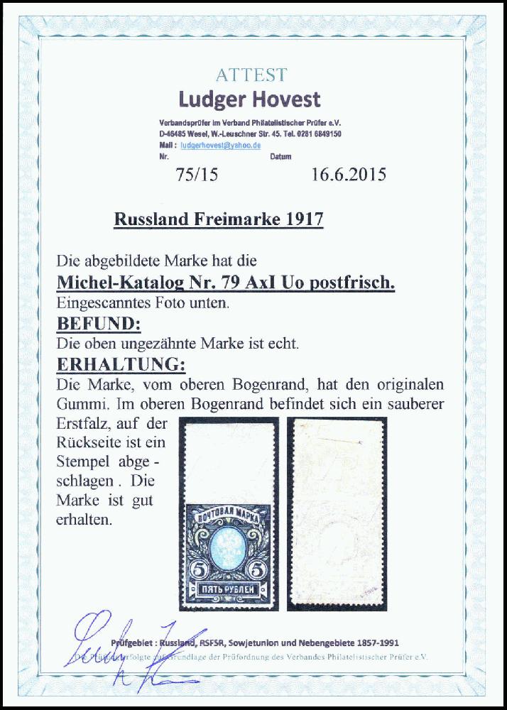 | Zusatzinformationen und Suchstichworte: | Württembergisches Auktionshaus 141. Versteigerung 09.-10. Dezember 2022 Los 1781 Russland 5 R., Abart: oben ungezähnt, postfr. Oberrandstück (dort Falzrest, 2 Zahnspitzen min. bräunlich), Fotoattest Hovest BPP.Katalogpreis: 320,- Ausruf 100,00 EUR |
