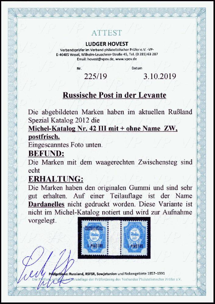 | Zusatzinformationen und Suchstichworte: | Württembergisches Auktionshaus 141. Versteigerung 09.-10. Dezember 2022 Los 1789 Russland Post in Levante 1 Pia., tadellos postfrisches, waagr. Zwischenstegpaar, die re. Marke mit Aufdruckfehler: nur Wertangabe "1 PIASTER" (ohne den Aufdruck "Dardanelles"). Eine außergewöhnliche Seltenheit der Russ. Post i.d. Levante, Fotoattest Hovest BPP ("Diese Variante ist nicht im Michel-Katalog notiert und wird zur Aufnahme vorgelegt"). Ausruf 400,00 EUR |