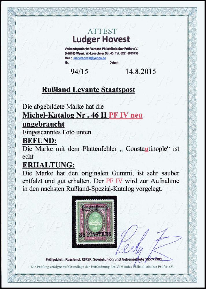 | Zusatzinformationen und Suchstichworte: | Württembergisches Auktionshaus 141. Versteigerung 09.-10. Dezember 2022 Los 1790 Russland Post in Levante 35 Pia., Aufdruckfehler IV: "Constautinople", tadellos ungebr. Exemplar mit vollem Originalgummi. Eine seltene Marke, Fotoattest Hovest BPP ("Der PF IV wird zur Aufnahme in den nächsten Russland-Spezialkatalog vorgelegt"). Ausruf 300,00 EUR |