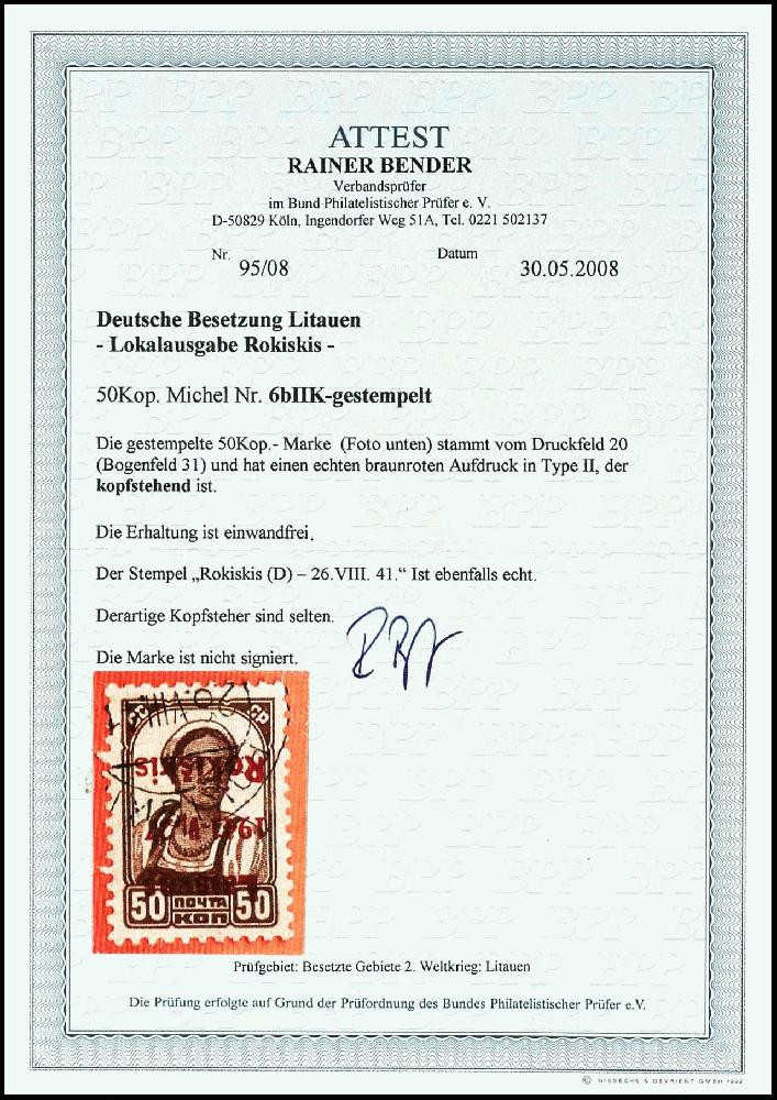 | Zusatzinformationen und Suchstichworte: | Dr. Reinhard Fischer 189. Auktion 24. - 26. November 2022 Los 4163 Deutsche Besetzung II. WK Litauen Rokiskis 50 Kop. Freimarke mit dreizeiligem braunrotem Bdr.-Aufdruck, Abart "kopfstehender Aufdruck", gestempelt, tadellose Erhaltung, nur wenige Exemplare bekannt, Attest Bender BPP: "echt und einwandfrei", Mi. 1.500.-++ Ausruf 500,00 EUR |