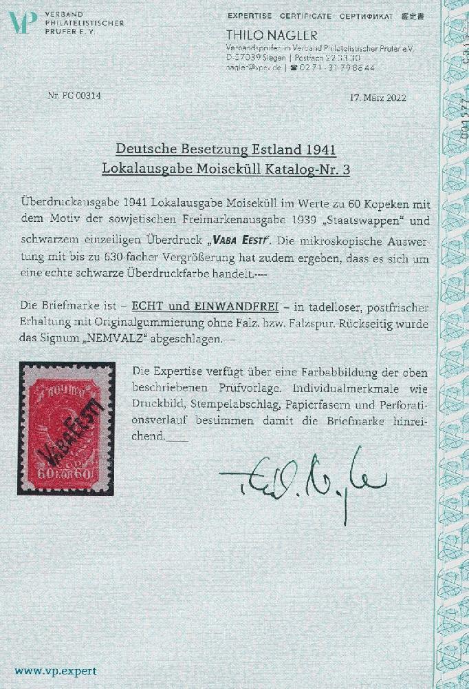 | Zusatzinformationen und Suchstichworte: | Ulrich Felzmann 176. Auktion 15. - 19. November 2022 Los 5630 Deutsche Besetzung II. WK Estland Moisek 60 K lilarot, postfrisch (!) in tadellos vollzähniger, selten so schön anzutreffender Top-Erhaltung, sign. Nemvalz sowie Fotoattest Nagler - Auflage nur 200 Exemplare, € 1.100,- Ausruf 500,00 EUR |