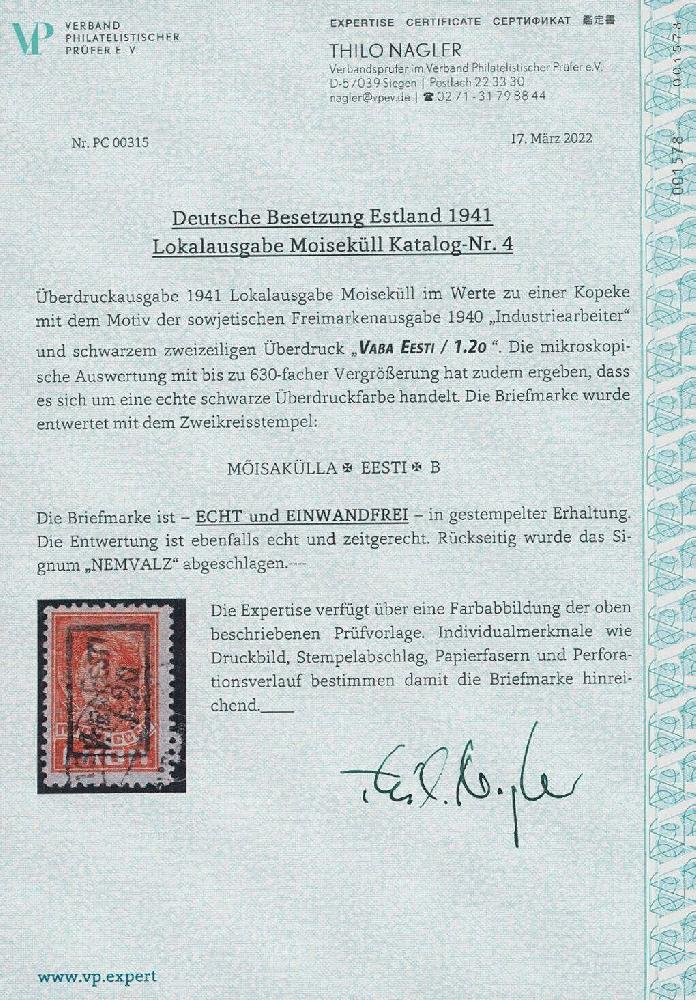 | Zusatzinformationen und Suchstichworte: | Ulrich Felzmann 176. Auktion 15. - 19. November 2022 Los 5631 Deutsche Besetzung II. WK Estland Moisek 1.20 auf 1 K orange, zeitgerecht gestempelt in tadellos vollzähniger Prachterhaltung, sign. Nemvalz sowie Fotoattest Nagler "... einwandfrei" - Auflage nur 400 Exemplare, € 500,- Ausruf 250,00 EUR |