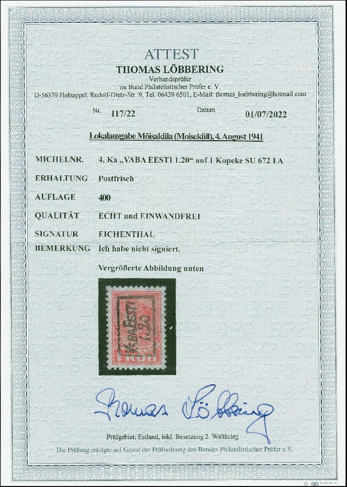 | Zusatzinformationen und Suchstichworte: | Heinrich Köhler 379. Auktion 19. - 24. September 2022 Los 3652 Deutsche Besetzung II. WK Estland Moisek 1,20 auf 1K., postfrisch, tadellos, sign. Eichenthal sowie Fotoattest Löbbering BPP (2022) Zuschlag 360,00 EUR |