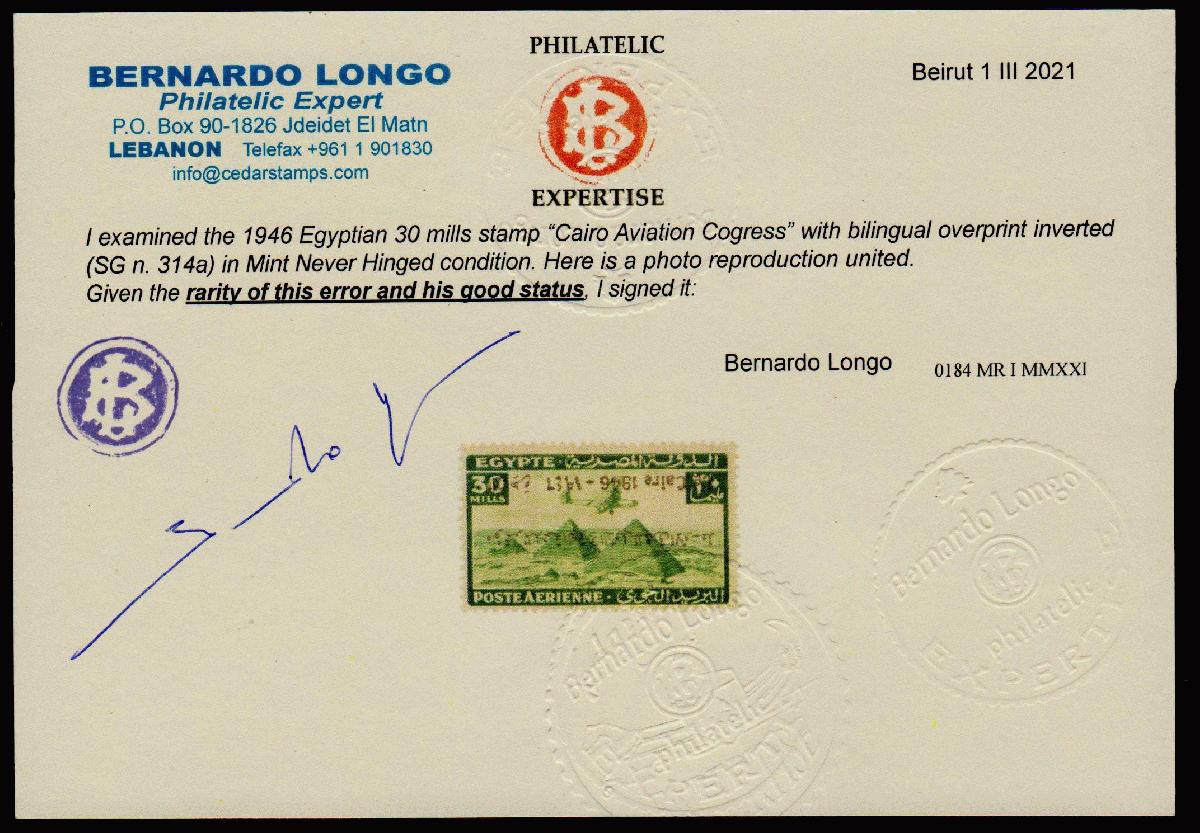 | Zusatzinformationen und Suchstichworte: | 34. Cedarstamps Auktion 19. November 2022 Los 26 Ägypten (Königreich) Ägypten, postfrisch 1946 Kairo Luftfahrtkongress 30 Mühle Briefmarke mit Überdruck kopfstehend (SG n 314a). B. Longo photoexpertise. Selten. Ausruf 200,00 EUR |