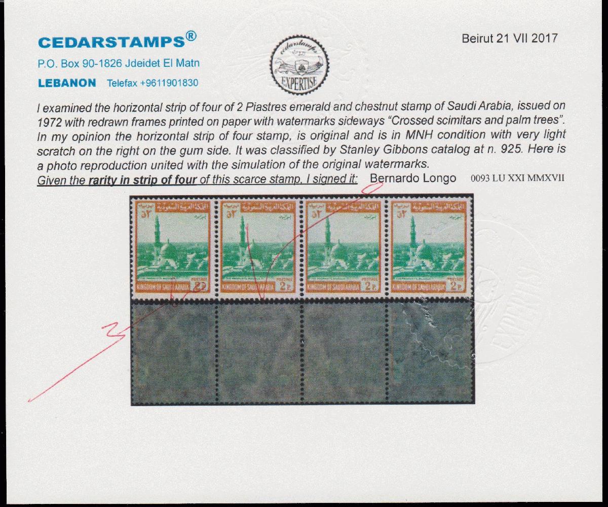 | Zusatzinformationen und Suchstichworte: | 34. Cedarstamps Auktion 19. November 2022 Los 344 Saudi Arabien Saudi-Arabien. Postfrisch 1972,2 Piaster smaragd und kastanienbraun mit Wasserzeichen "durchquerten Krummsäbel und Palmbäumen" in waagrechter Viererstreifen (SG n 925 x 4). Hell und begrenzt Störungen im rechten Bereich des Leim. Bernardo Longo photoexpertise. Selten Viererstreifen dieser seltenen Marke. Ausruf 350,00 EUR |