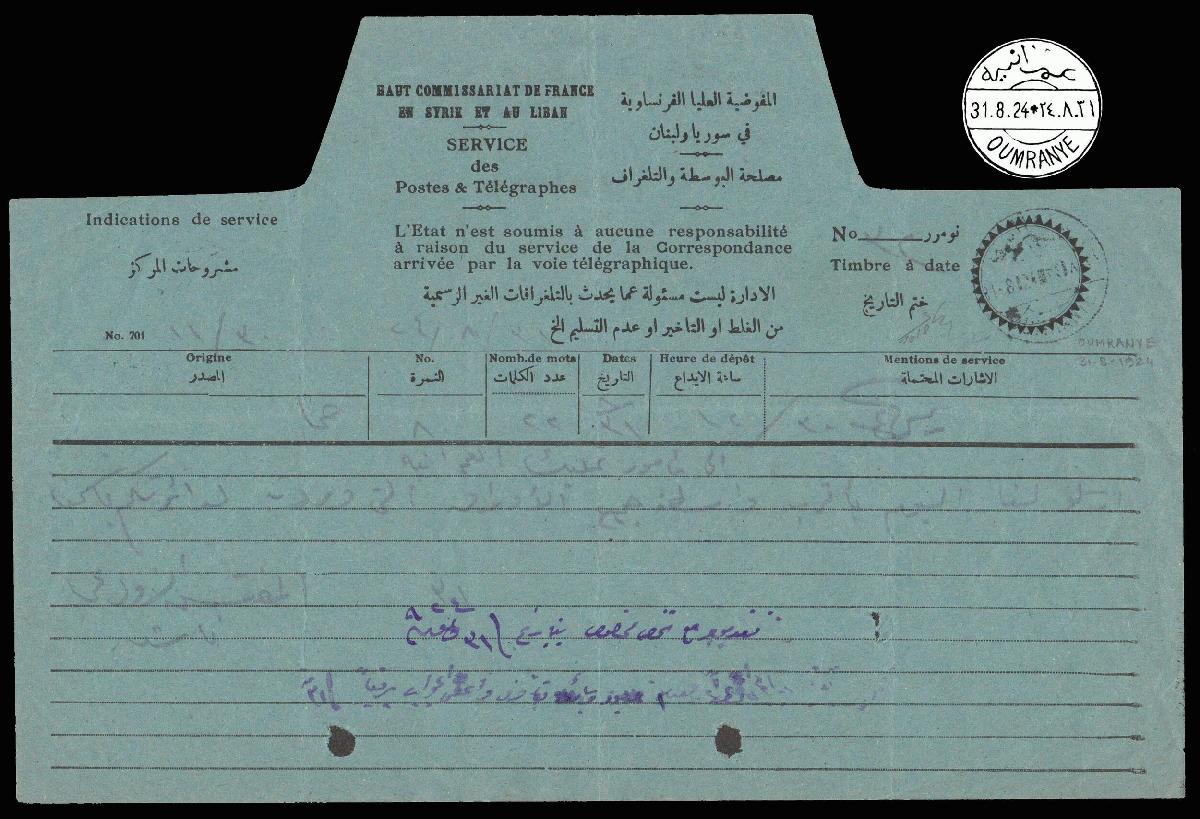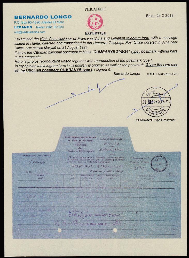 | Zusatzinformationen und Suchstichworte: | 34. Cedarstamps Auktion 19. November 2022 Los 398 Syrien Syrien französischer Mandat. Zweisprachiges Telegrammformular gebraucht abschreiben ein Kommunikation gesendet telegrafisch verausgabt in Hama zu Oumranye (heute Masyaf Stadt). Die post Meisters aufgebracht am die Telegrammformular die nicht verzeichnet osmanisch zweisprachiges Poststempel "OUMRANYE 31-8-24" in schwarz. B. Longo photocertificates. Nicht verzeichnet extrem seltener Stempel. Ausruf 250,00 EUR |