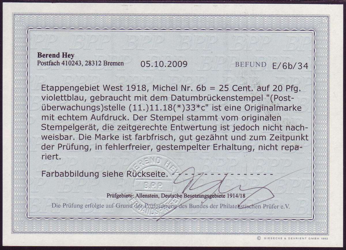 | Prüfer: | Hey, Berend (BPP (Bund Philatelistischer Prüfer)) |