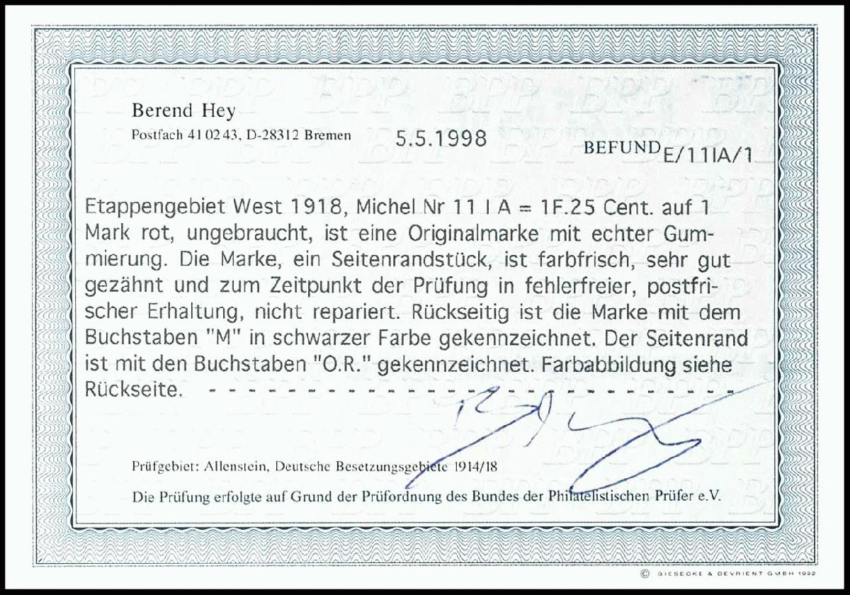 | Prüfer: | Hey, Berend (BPP (Bund Philatelistischer Prüfer)) |