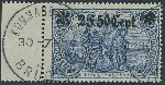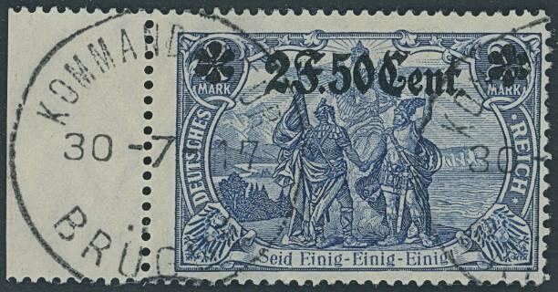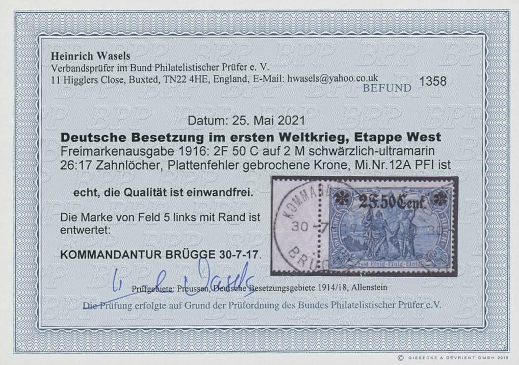 | Zusatzinformationen und Suchstichworte: | Ulrich Felzmann 34. e@uction 5. - 9. September 2022 Los 14266 Deutsche Besetzung I. WK Etappengebiet West 2 F 50 Cent auf 2 Mk, 26:17 Zähnungslöcher, mit Plattenfehler "Krone links beschädigt", Prachtstück mit linkem Seitenrand, sauber gestempelt KOMMANDANTUR BRÜGGE 30.7.17, Fotobefund Wasels BPP "... einwandfrei" Ausruf 80,00 EUR |