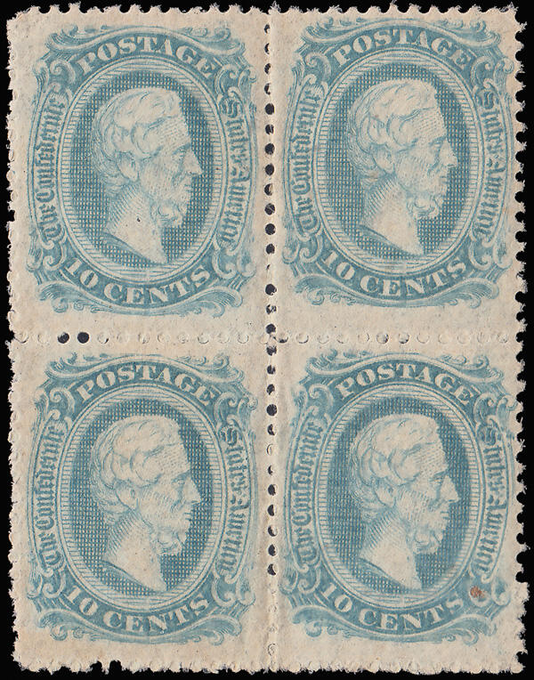 | Zusatzinformationen und Suchstichworte: | Kelleher 777. Auktion 15. - 17. November 2022 Los 1252 Konföderierte Staaten 1863,10¢ blau, Archer und Daly gezähnt 12½ (Scott 11e), Kabinett ungebrauchter Viererblock, Originalgummi kleiner Falz oben nur, frisch und ungewöhnlich gut zentriert; natürlicher Papiereinschluss unten rechts von die Marke rechts unten, Kabinett, ex Lippman. Ein seltener Block mit 1949 S. P. A. Attest. Scott $2,000 Ausruf 600,00 USD |