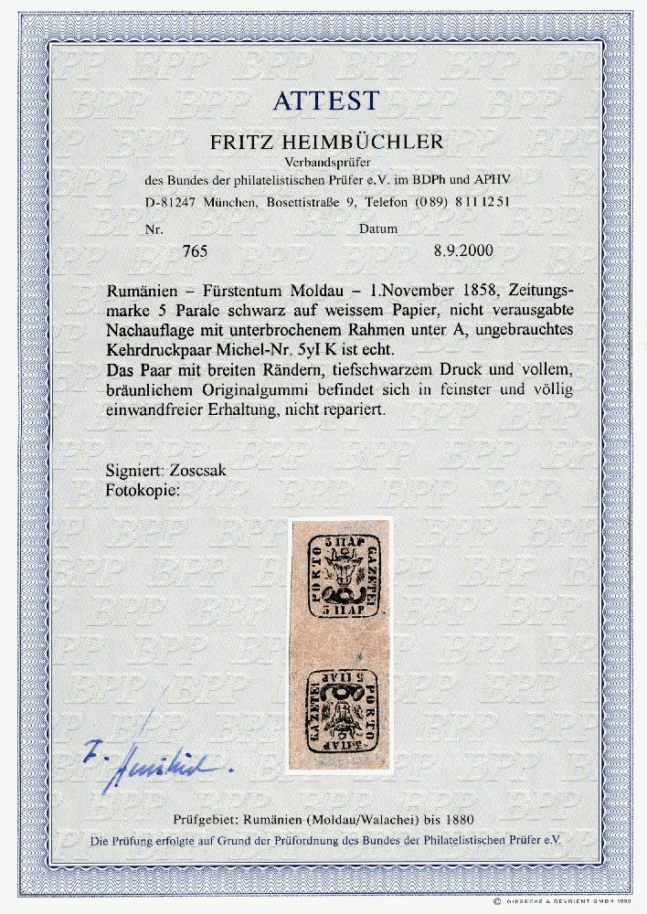 | Zusatzinformationen und Suchstichworte: | David Feldman S.A. - Alle Welt 5. - 9. Dezember 2022 Los 60368 Rumänien 1858, Moldavia, 5 parale schwarz, auf weißem Papier, ungebraucht, Originalgummi, rückseitig gedruckt Paar, Zeitungsmarke, nicht ausgegeben Neudruck mit Rahmenbruch im Rahmen eines, breit gerandet, sehr tief Schwarzdruck, ausnahmsweise fein ungebrauchtes Stück; Attest Heimbüchler (2000), (Mi € 750) Ausruf 200,00 EUR |