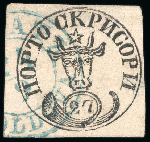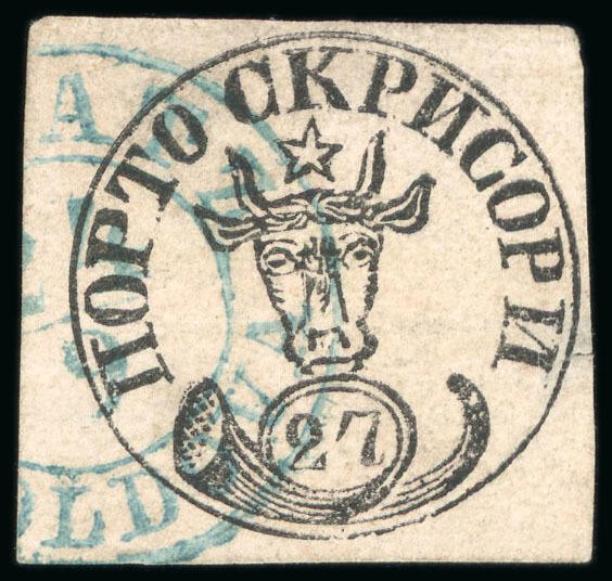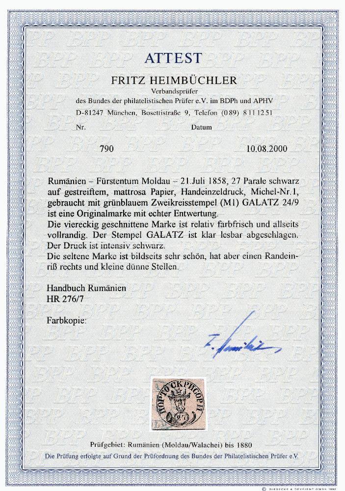 | Zusatzinformationen und Suchstichworte: | David Feldman S.A. - Alle Welt 5. - 9. Dezember 2022 Los 60358 Rumänien 1858, Moldavia, 27 parale schwarz, gedruckt auf rosa genetzt waagrecht gestreiftes Papier, paradiesisch scharfer Druck, sehr fein gebraucht, gestempelt mit dem blauem Datumsstempel von Galatz datiert 24-9, etwas hell und Einriß in richtigem Seite, jedoch ist das 27p ist selten gebraucht in Galatz, eine der 10 verzeichnet Einzelmarken bei dieser Kreisdatumsstempel; ein ansprechende Briefmarke; Attest Heimbüchler (2000), (Mi € 12000) Ausruf 3.000,00 EUR |