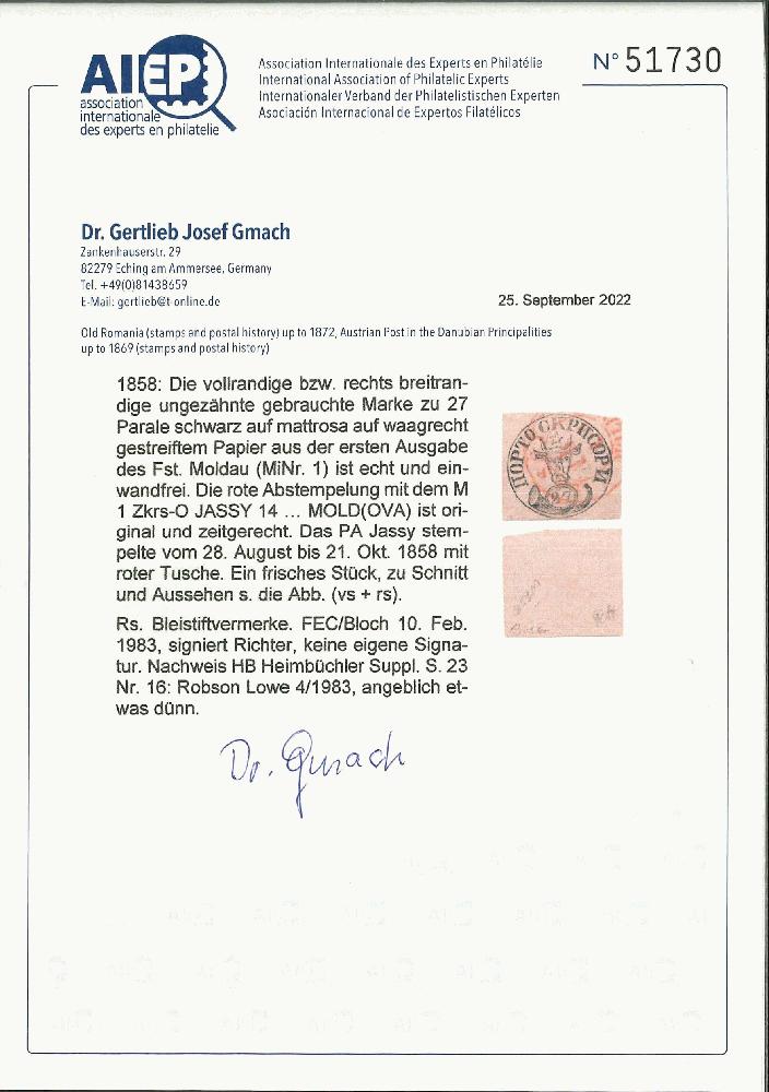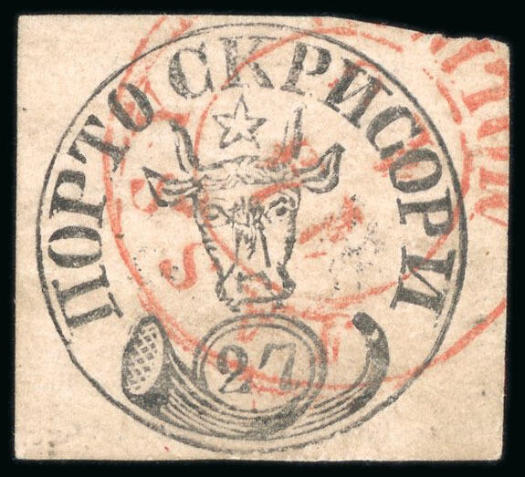 | Zusatzinformationen und Suchstichworte: | David Feldman S.A. - Alle Welt 5. - 9. Dezember 2022 Los 60360 Rumänien 1858, 27 parale black on matt pink on horizontally ribbed paper, fine to large margins, JASSY double circle cancellation in red (Jassy stamped in red ink from August 28 to October 21, 1858), a flawless and fresh example (Mi. €15'000). Ausruf 6.000,00 EUR |