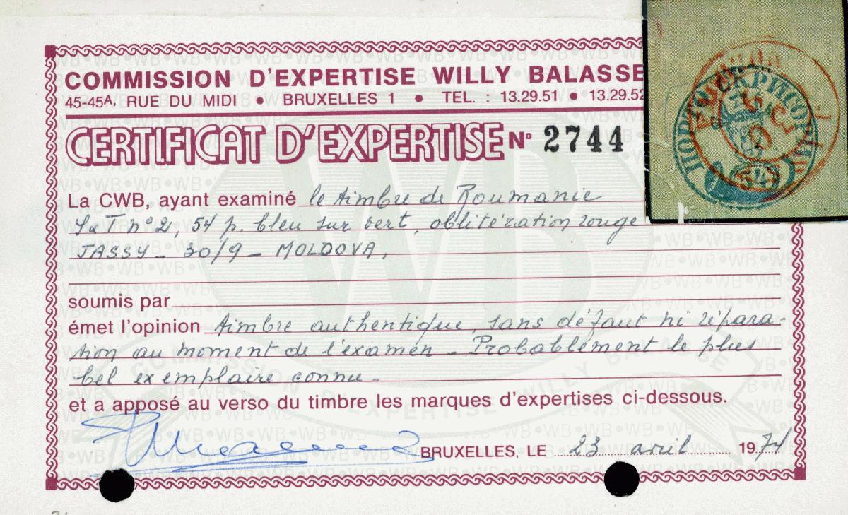 | Zusatzinformationen und Suchstichworte: | David Feldman S.A. - Alle Welt 5. - 9. Dezember 2022 Los 60361 Rumänien 1858, Moldavia, 54 parale blau, auf grünlichblau waagrecht gestreiftes Papier, scharfe intensive Farbe, Pracht gebraucht, ringsum voll- bis breitrandig mit vollständigem rot Kreisdatumsstempel von Jassy datiert 30-9 (dieses Stempel in gebraucht zwischen Aug 28. und Oct 18. 1858), ein schönes Stück von dieser ikonisch Ausgabe, eine der schönsten bekannten vorhanden; nur eine Handvoll existieren in dieser Zuschlag Erhaltung; Attest Balasse (1974) und Gmach (2022) und signiert A. Diena; ex Heimbüchler (illustriert auf Seite 342-3), Mohrmann, Kohler und Steltzer; (Mi € 5500) Ausruf 4.000,00 EUR |