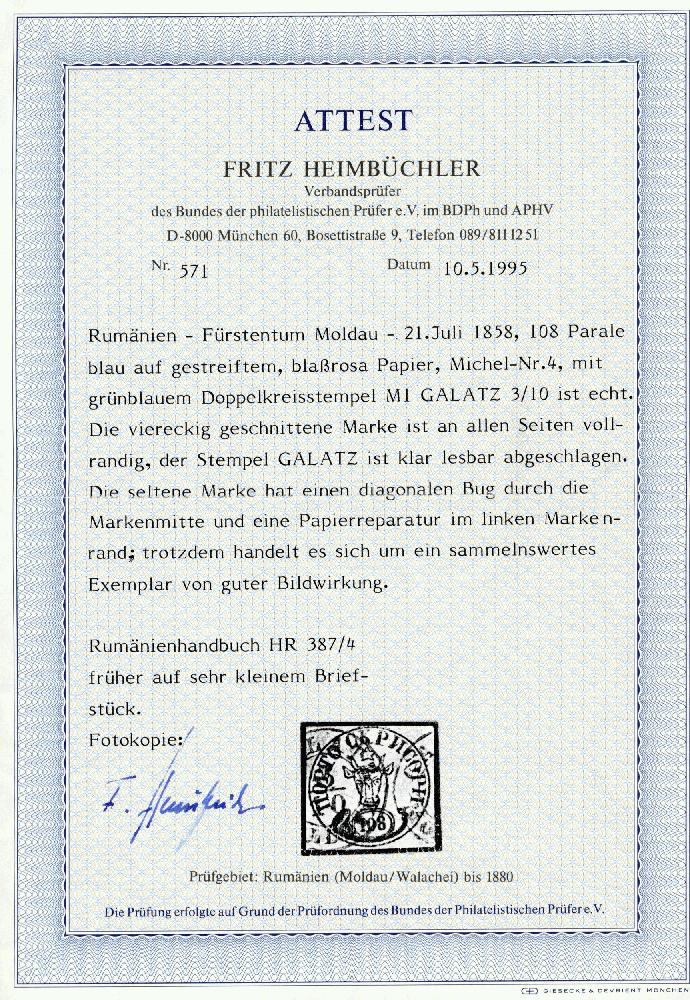| Zusatzinformationen und Suchstichworte: | David Feldman S.A. - Alle Welt 5. - 9. Dezember 2022 Los 60364 Rumänien 1858,108 parale blau, auf blassrosa waagrecht gestreiftes Papier, intensive Farbe, gebraucht, gerandet ringsum, gestempelt mit ein Galatz Kreisdatumsstempel datiert 2-10, hat eine Diagonalbug durch die Zentrum von Briefmarke und ein Reparatur nach links; nur 16 einzeln Stücke der 108 parale sind bekannt entwertet in Galatz, eine seltene Poststempel auf diese seltene Marke, erwähnt im Tebeica; Attest Heimbüchler (1995), (Mi € 12000) Ausruf 2.500,00 EUR |