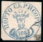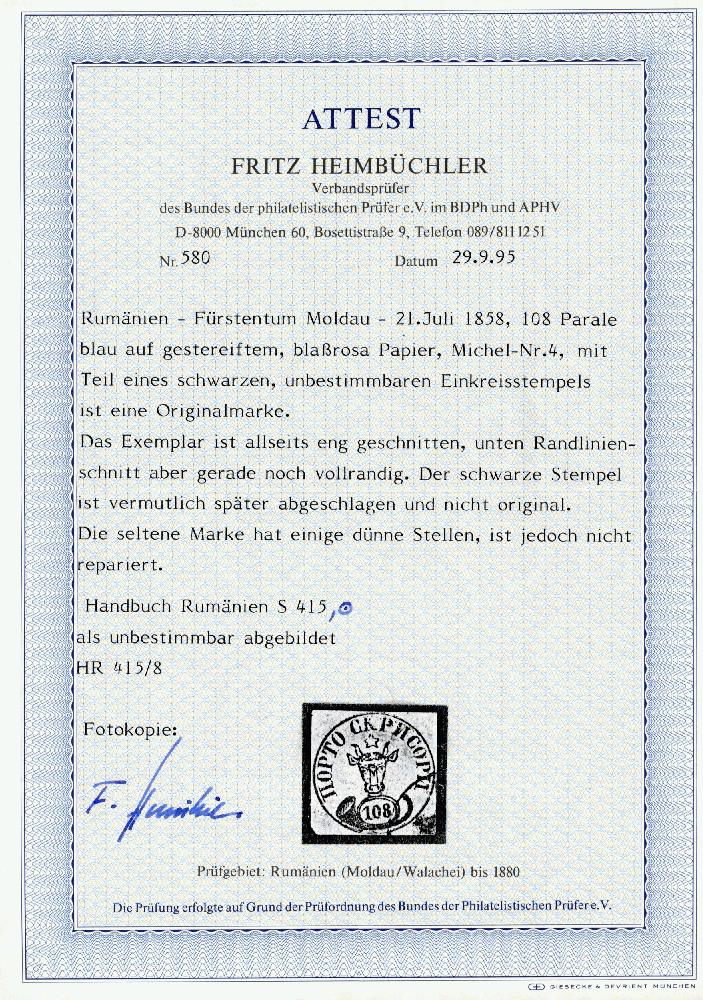 | Zusatzinformationen und Suchstichworte: | David Feldman S.A. - Alle Welt 5. - 9. Dezember 2022 Los 60365 Rumänien 1858, Moldavia, 108 parale blau, auf blassrosa waagrecht gestreiftes Papier, mit vier Rändern, verdünnt aber ein feines nicht repariert Beispiel, der Poststempel nicht identifizierbaren, vermutlich von später Entstehungen; Attest Heimbüchler (1995) und Teil der Heimbüchler Aufstellung 415-8; (Mi € 1200) Ausruf 2.000,00 EUR |