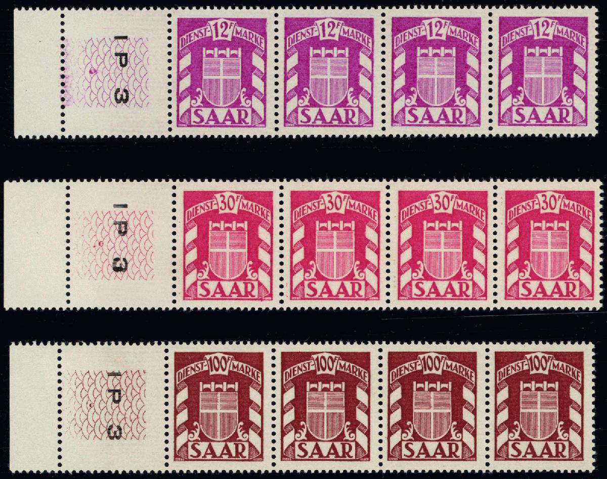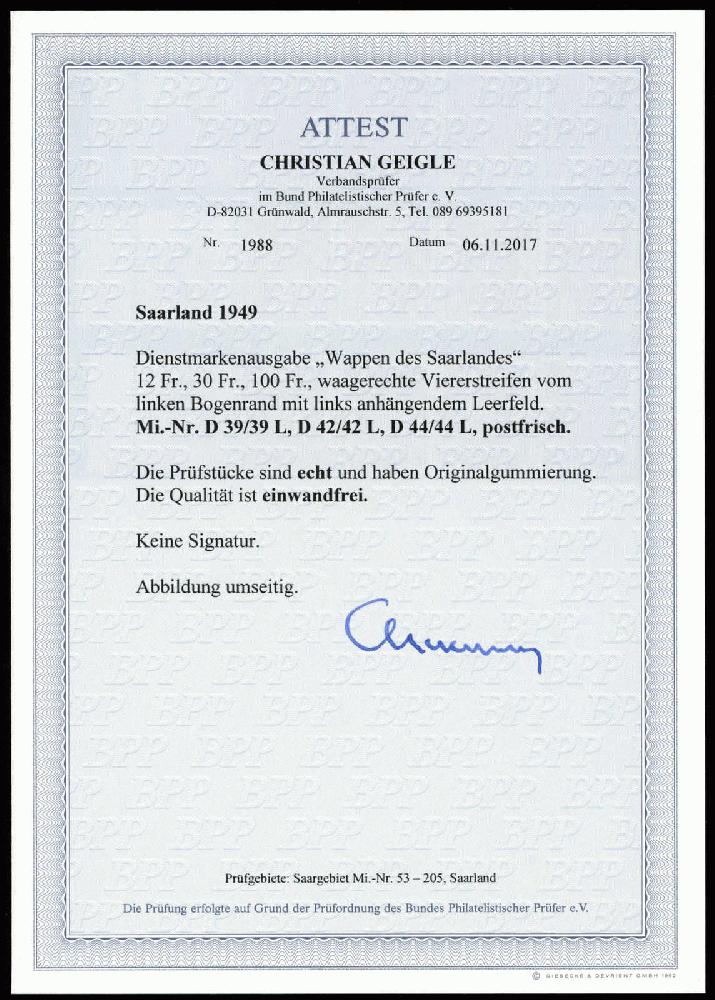 | Zusatzinformationen und Suchstichworte: | 80. HBA Auktion 9. - 12. November 2022 Los 1602 (D) Saarland 1949, Dienstmarken Wappen, 12 W. kpl., in waagerechten Viererstreifen vom linken Bogenrand mit links anhängendem Leerfeld und weiterem Bogenrand, tadellos postfrischer Kabinettsatz, ohne Signaturen und gepr. Geigle mit Fotoattest, Mi. 850,-- Zuschlag 200,00 EUR |