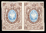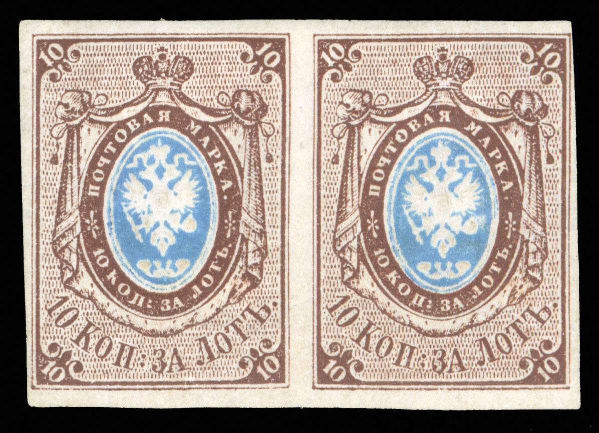 | Zusatzinformationen und Suchstichworte: | Cherrystone - Rare Stamps and Covers of the World 13. - 14. September 2022 Los 1160 Russland 1857 10k brown & blue, unused horizontal pair, with original gum, hinge remnant, paper thickness 0.11 mm, colorless "1" watermark shifted to left, margins all around, light bend between stamps, full embossing and vivid colors, very fine. An unused Russia Number One single is a world-class rarity, of which only a few have been recorded. Outside of the Popov Museum in St. Petersburg, this is the only genuine unused pair of the first stamp of Russia in private hands. While "unused" examples have surfaced over the years, they have generally been determined to have been cleaned, have pen cancels removed, etc. It is a privilege to offer this remarkable unused pair of Russia Number One, with full original gum and to our knowledge, never before shown or offered for sale, accompanied by a 2022 Buchsbayew certificate. A wonderful treasure of Imperial Russian Philately (Scott Catalogue "Genuine unused examples of No.1 are exceedingly scarce. Most of those offered are used with pen cancellation removed. The unused value is for an example without gum. The very few known stamps with original gum sell for much more (catalogue value $125,000 as two singles without gum) Zuschlag 130.000,00 USD |