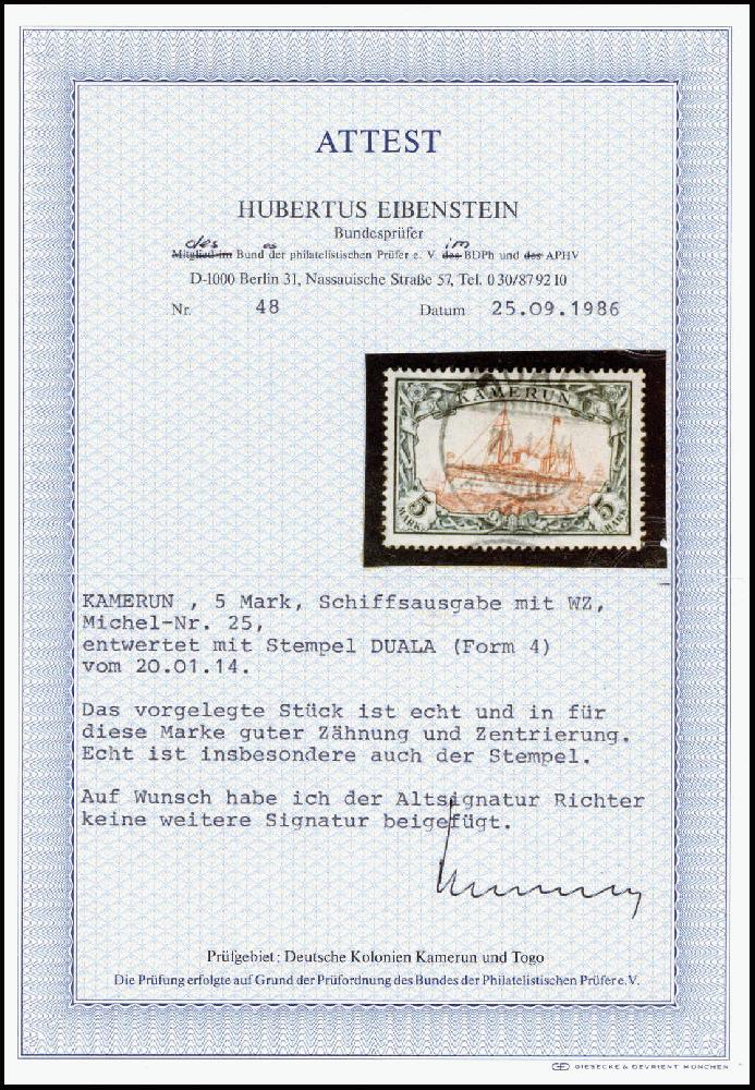 | Zusatzinformationen und Suchstichworte: | Württembergisches Auktionshaus 141. Versteigerung 10. Dezember 2022 Los 6410 Deutsche Kolonien Kamerun 5 Mk., tadelloses Exemplar in perfekter Zähnung und Zentrierung mit zentr. aufges. Stempel DUALA 20/1 14, sign. Richter, Fotoattest Eibenstein BPP. Katalogpreis: 4.800,- Ausruf 1.200,00 EUR |