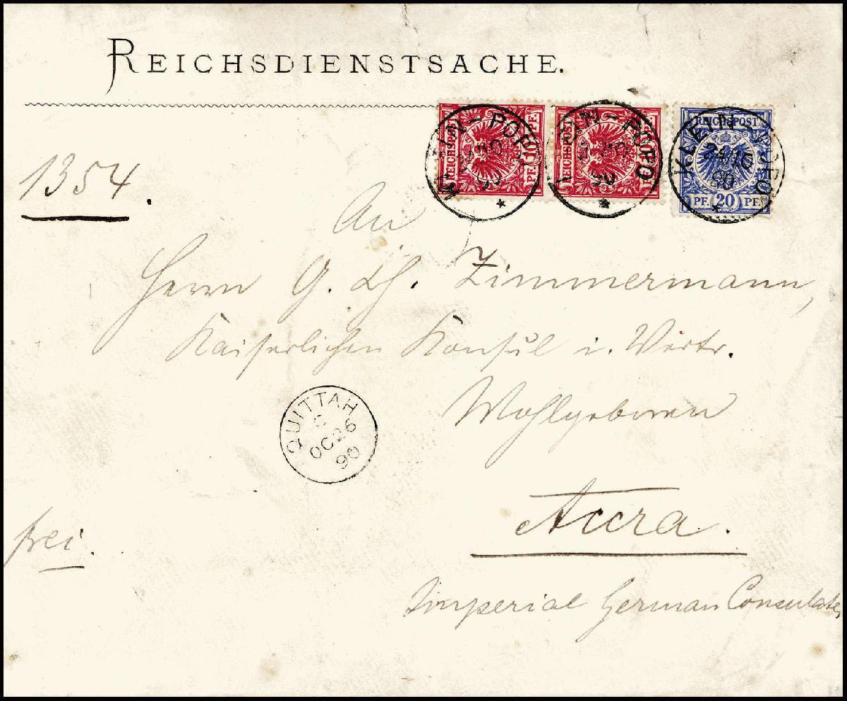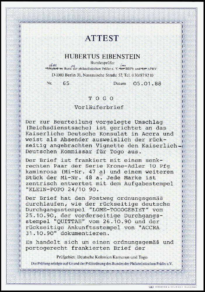 | Zusatzinformationen und Suchstichworte: | Württembergisches Auktionshaus 141. Versteigerung 10. Dezember 2022 Los 6998 Deutsche Kolonien Togo, Vorläufer 10 Pfg. rosarot zusammen mit 20 Pfg. ultramarin, die beiden ersten in Togo verwendeten Auflagen der Krone/Adler-Ausgabe auf li. etwas verkürztem Leinenkuvert mit Vordruck "Reichs-Dienstsache" an das Deutsche Konsulat in Accra/Goldküste. Jede Marke mit sauber aufges. Stempel KLEIN-POPO 24/10 90, rs. blaue Siegelmarke des deutschen Kommissars für Togo nebst Durchgangsstpl. LOME TOGOGEBIET 26/10 90 und Eingangsstempel vom 31.10.1890. Trotz Beförd.-Spuren stellt vorliegender Brief mit gleich zwei Exemplaren der extrem seltenen 10 Pfg. rosarot eine ganz große Vorläufer-Rarität dar, Fotoattest Eibenstein BPP. Katalogpreis: 6.500,-+ Ausruf 1.200,00 EUR |