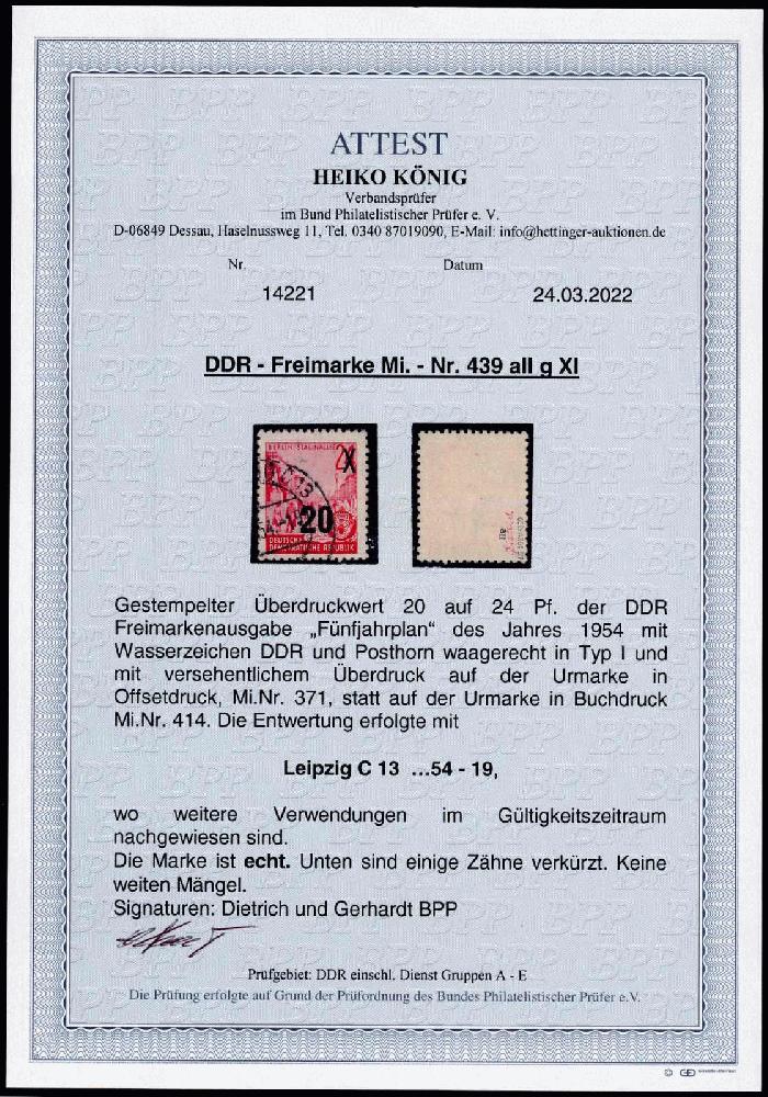 | Zusatzinformationen und Suchstichworte: | 31. Schlegel Auktionshaus Auktion 14. - 18. November 2022 Los 11129 DDR 1954, 20 auf 24 Pfg. Fünfjahrplan bräunlichkarmin mit Wasserzeichen DDR und Posthorn waagerecht Typ I und versehentlichem Überdruck auf die Urmarke im Offsetdruck, entwertet "LEIPZIG C 13 ... 54", dort sind weitere Entwertungen im Gültigkeitszeitraum nachgewiesen, einige Zähne verkürzt, signiert Dietich und Gerhardt BPP, Fotoattest König BPP 03/2022 (ME 2.400,-) Ausruf 500,00 EUR |