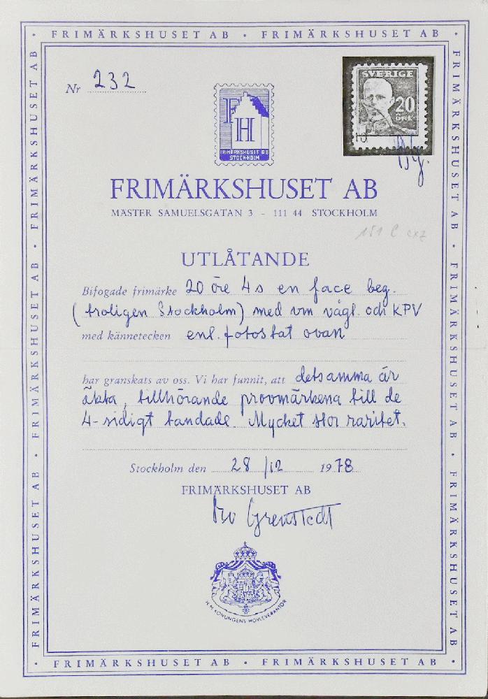 | Zusatzinformationen und Suchstichworte: | AB Philea 397. Auktion 24. November 2022 Los 2244 Schweden Sweden, Facit 151Ccxz or Scott 141 used, 1920 Gustaf V full face 20 öre dull blue perf 9¾ on four sides with wmk lines + KPV. Very fresh copy with part of cancellation STOCKHOLM. One of the best copies known of this COIL STAMP RARITY. Certificate by Frimärkshuset / Grenstedt (1978) Ausruf 1.819,00 EUR |