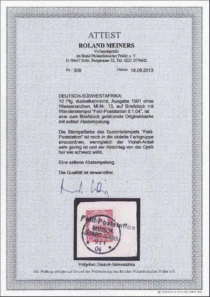 | Zusatzinformationen und Suchstichworte: | Götz 400. Auktion 11. - 15. November 2022 Los 3035 Deutsche Kolonien Südwestafrika 10 Pfg. Schiffszeichnung auf herrlichem Bfst. mit ergänztem violettschwarzem L1 "Feld-Poststation". Farbfotoattest Meiners Ausruf 500,00 EUR |