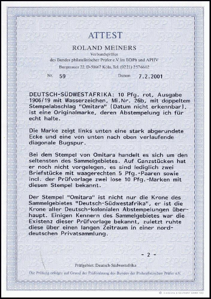 | Zusatzinformationen und Suchstichworte: | Württembergisches Auktionshaus 141. Versteigerung 10. Dezember 2022 Los 261 + Deutsche Kolonien Südwestafrika OMITARA, klarer Doppel-Abschlag auf farbfrischer 10 Pfg. (kl. Mgl.). Von dieser legendären Abstempelung ist neben zwei 5-Pfg.-Paaren nur noch eine weitere lose 10-Pfg.-Marke bekannt geworden. Ganzstücke sind nach mehr als 100 Jahren bisher nicht aufgetaucht. Ein Spitzenstück der DSWA-Philatelie, Fotoattest Meiners BPP ("Der Stempel OMITARA ist nicht nur die Krone des Sammelgebietes DSWA, er ist die Krone aller deutsch-kolonialen Abstempelungen überhaupt"). Ausruf 3.000,00 EUR |