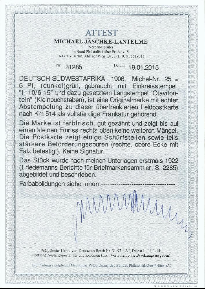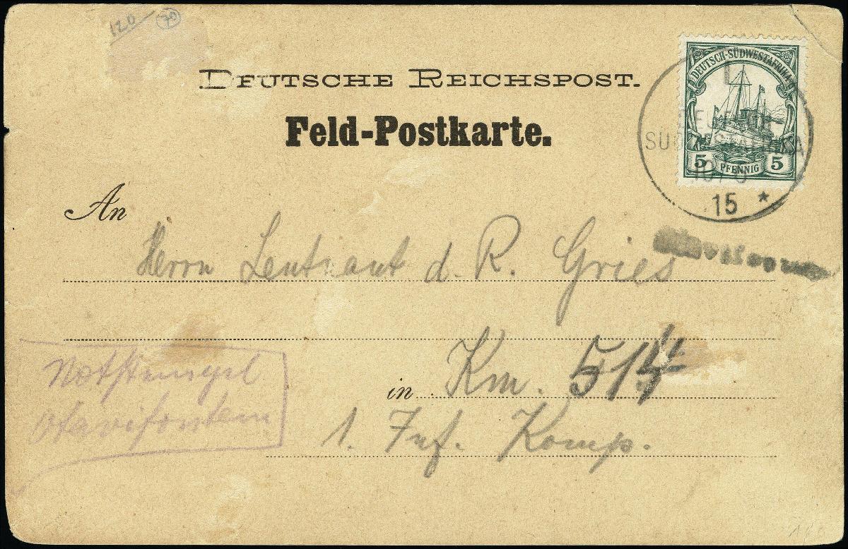 | Zusatzinformationen und Suchstichworte: | Heinrich Köhler 379. Auktion 19. - 24. September 2022 Los 3139 Deutsche Kolonien Südwestafrika 1915, Kaiseryacht 5 Pfg. mit Wanderstempel vom 10.6.15 auf Feldpost-Vordruckkarte mit nebengesetztem, schwarzen L1 "Otavifontein", adressiert nach Km 514, Karte mit stärkeren Beförderungs- und Alterungsspuren, rechte, obere Ecke mit Falz befestigt, unnötig frankierte, aber seltene Bedarfsverwendung mit viel Text, Fotoatteste Meiners BPP (2014) und Jäschke-L. BPP (2015) Zuschlag 750,00 EUR |